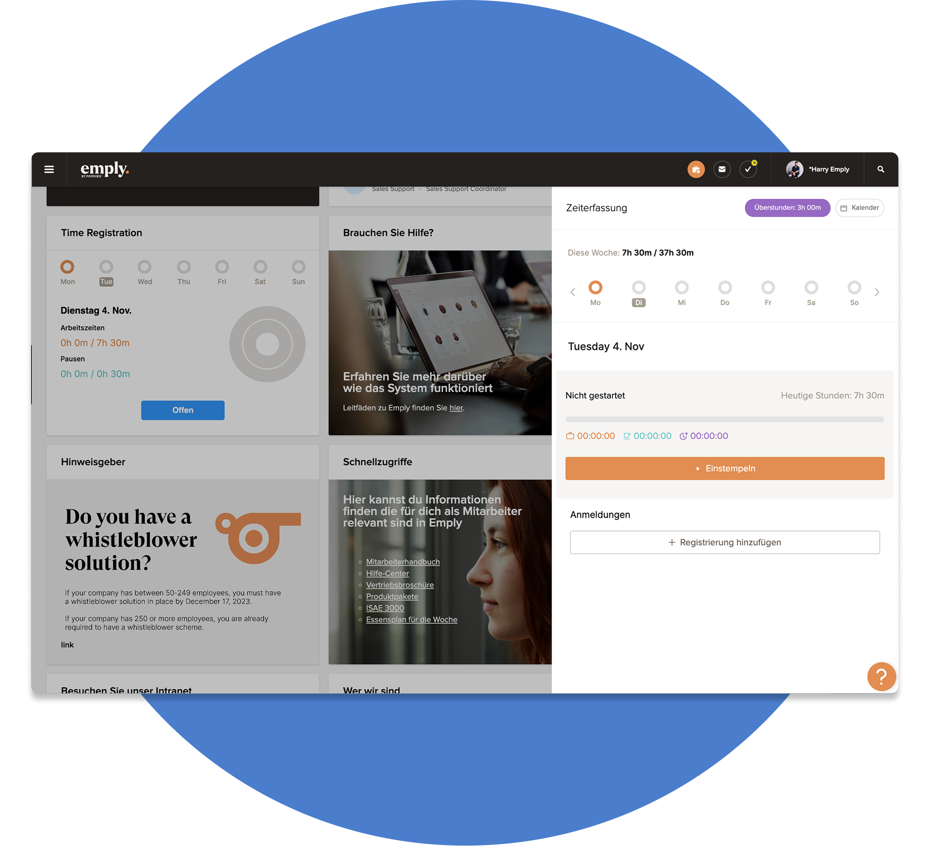 Das Zeiterfassungstool von Emply bietet entscheidende Einblicke in die Arbeitszeiten Ihrer Mitarbeiter und sorgt dafür, dass sie ein ausgewogenes Verhältnis zwischen Arbeit und Erholung beibehalten.